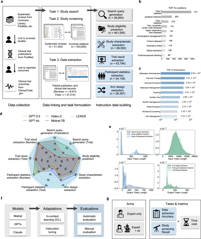 (a) LEADSInstruct bao gồm hơn 20.000 tổng quan hệ thống, 453.000 bài báo khoa học, và 27.000 thử nghiệm lâm sàng được liên kết từ nhiều nguồn dữ liệu khác nhau. Một phương pháp lai (hybrid approach) được áp dụng để chuyển đổi các dữ liệu liên kết này thành bộ dữ liệu huấn luyện theo hướng dẫn (instruction data), bao phủ sáu nhóm nhiệm vụ chính trong khai thác y văn. (b) Biểu đồ cột thể hiện số lượng các tổng quan hệ thống theo từng nhóm bệnh lý (conditions). (c) Biểu đồ cột thể hiện số lượng các tổng quan hệ thống theo từng nhóm can thiệp (interventions). (d) Phân tích so sánh hiệu năng giữa mô hình LEADS và các mô hình AI tiên tiến, bao gồm cả mô hình thương mại độc quyền và mã nguồn mở. Các chỉ số đánh giá bao gồm: Recall cho nhiệm vụ tạo truy vấn tìm kiếm (search query generation), Recall@50 cho nhiệm vụ đánh giá tính phù hợp của nghiên cứu (study eligibility assessment), và Accuracy cho các nhiệm vụ còn lại. (e) Biểu đồ mật độ (density plot) mô tả phân bố số lượng tokens trong phần đầu vào và đầu ra của các tập dữ liệu huấn luyện theo hướng dẫn. (f) Hình minh họa thiết lập thí nghiệm (experimental setups). (g) Hình minh họa thiết kế nghiên cứu người dùng (user study setup).