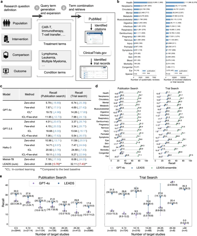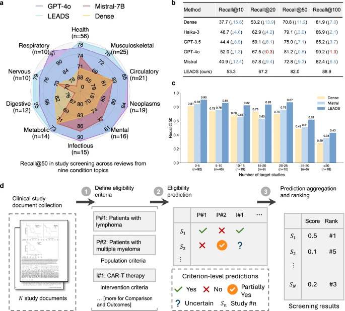 Công trình giới thiệu LEADS — mô hình ngôn ngữ nền tảng (foundation model) dành riêng cho khai thác y văn, được huấn luyện trên hơn 633.759 mẫu dữ liệu từ 21.335 tổng quan hệ thống, 453.625 bài báo thử nghiệm lâm sàng và 27.015 cơ sở dữ liệu ClinicalTrials.gov. LEADS là bước tiến quan trọng trong việc kết hợp giữa con người và trí tuệ nhân tạo để tăng tốc quá trình tổng quan y học bằng chứng.