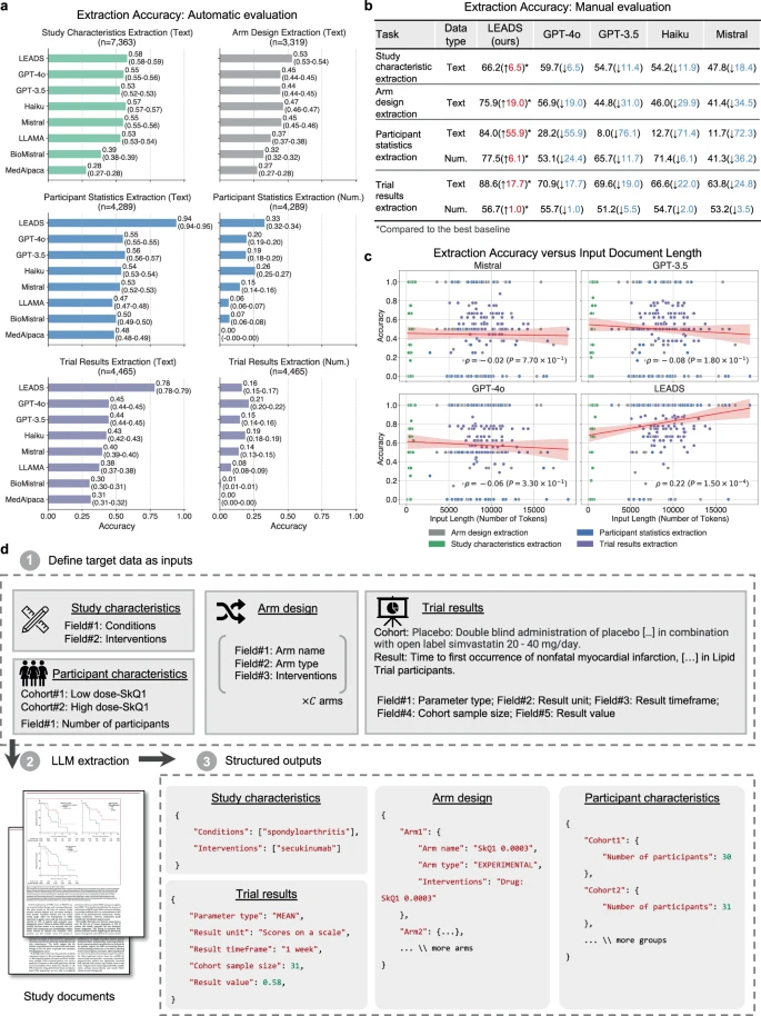 (a) Độ chính xác trung bình (Mean accuracy) của LEADS và các mô hình ngôn ngữ lớn (LLMs) khác trong bốn nhiệm vụ trích xuất dữ liệu, được đánh giá bằng phương pháp tự động (automatic evaluation). Các giá trị trong ngoặc đơn biểu thị khoảng tin cậy 95% (95% confidence intervals). (b) Độ chính xác của LEADS và các LLMs khác trong bốn nhiệm vụ trích xuất dữ liệu, được đánh giá bằng phương pháp thủ công (manual evaluation). (c) Độ chính xác của LEADS và các LLMs khác theo độ dài khác nhau của tài liệu đầu vào trong bốn nhiệm vụ trích xuất dữ liệu, được đánh giá bằng phương pháp thủ công. Đường màu đỏ biểu thị đường hồi quy (regression line) thể hiện mối quan hệ giữa độ chính xác trung bình và độ dài đầu vào; vùng được tô bóng thể hiện khoảng tin cậy 95%. Ký hiệu ρ (rho) biểu thị hệ số tương quan Pearson, và P đại diện cho giá trị p hai phía (two-sided p-value) dùng để kiểm định giả thuyết không có mối tương quan giữa độ dài đầu vào và độ chính xác. (d) Minh họa cách LEADS thực hiện bốn nhiệm vụ trích xuất dữ liệu thông qua học trong ngữ cảnh (in-context learning). Dựa trên định nghĩa của trường dữ liệu mục tiêu (target field) và các nhóm đối tượng (cohorts), LEADS xử lý các tài liệu nghiên cứu và tạo ra kết quả có cấu trúc (structured outputs).